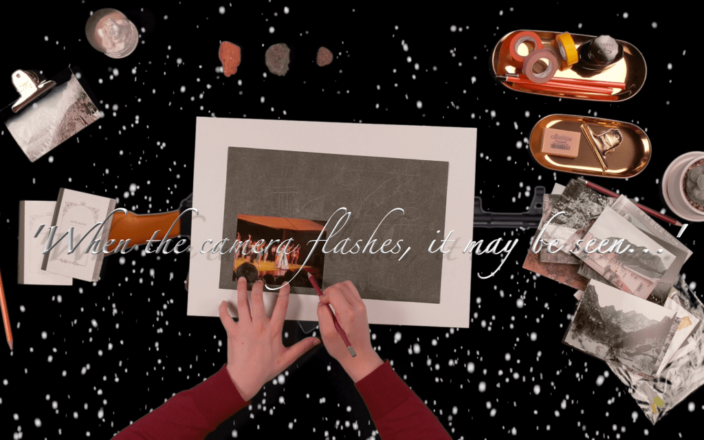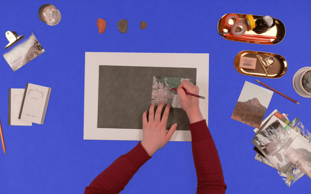 10여 년 전 금강산 관광을 다녀온 다섯 사람의 여행 수기를 조합한 이야기를 낭독한다. 카메라는 테이블 위에 놓인 다섯 사람이 제공한 기록 사진을 내려다보는 시점으로 담는다. 화면에 등장한 두 손은 먹지를 이용해 사진을 베껴 그리고, 영상은 하나의 풍경 드로잉을 완성하는 과정을 긴 호흡으로 담는다. 다양한 시간대에 촬영된 동일한 장소의 사진을 선택적으로 조합하고 재현하며 금강산에 얽힌 다양한 기억의 형태와 체험, 그리고 질감을 상연한다.