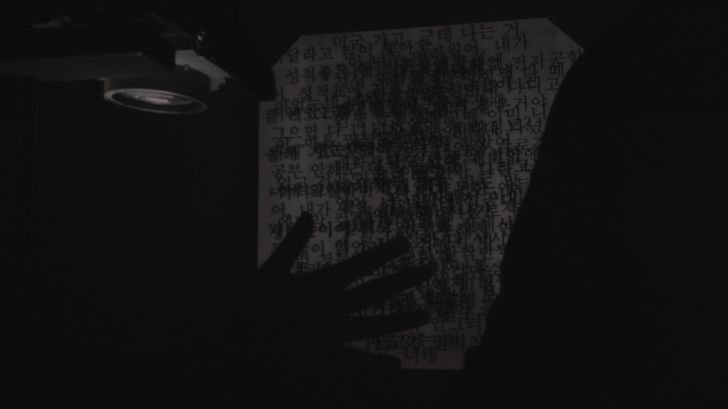 투명 필름에 인쇄된 문장이 영사기의 빛을 통과해 벽면에 쌓인다. 검은색 글자들이 차곡차곡 벽벼지며 영상 속 공간은 점차 어두워진다. 필름에 인쇄된 이야기는 1993년생인 작가가 스물여덟에 결혼을 결심한 1961년생 어머니로부터 여러 차례 들은 ‘결혼’에 관련한 수많은 이야기 중 하나다. 작가는 오랜 시간 반복해 들은 이 이야기를 기록하고 하나의 이야기로 엮고 낭독했다. 서울에서 나고 자란 작가와 경상북도 대구에서 나고 자란 어머니의 28세 시기가 교차되고, 두 사람의 지역적 정체성은 어색한 사투리를 통해 구체화된다. 기억, 텍스트 그리고 낭독을 매개로 어머니와 딸 사이의 기억이 연결된 관계를 드러내고자 했지만, 각자의 고유한 목소리와 이야기의 어긋남을 통해 개별적인 정체성을 유지하고자 했다.