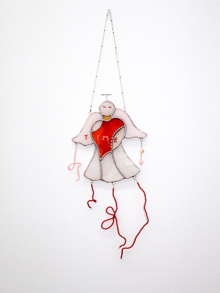 〈루트 드로잉-시간 천사(Route Drawing-Engel der Zeit)〉, 2022, 스테인드 글라스, 유리 비즈, 체인, 가변크기 설치