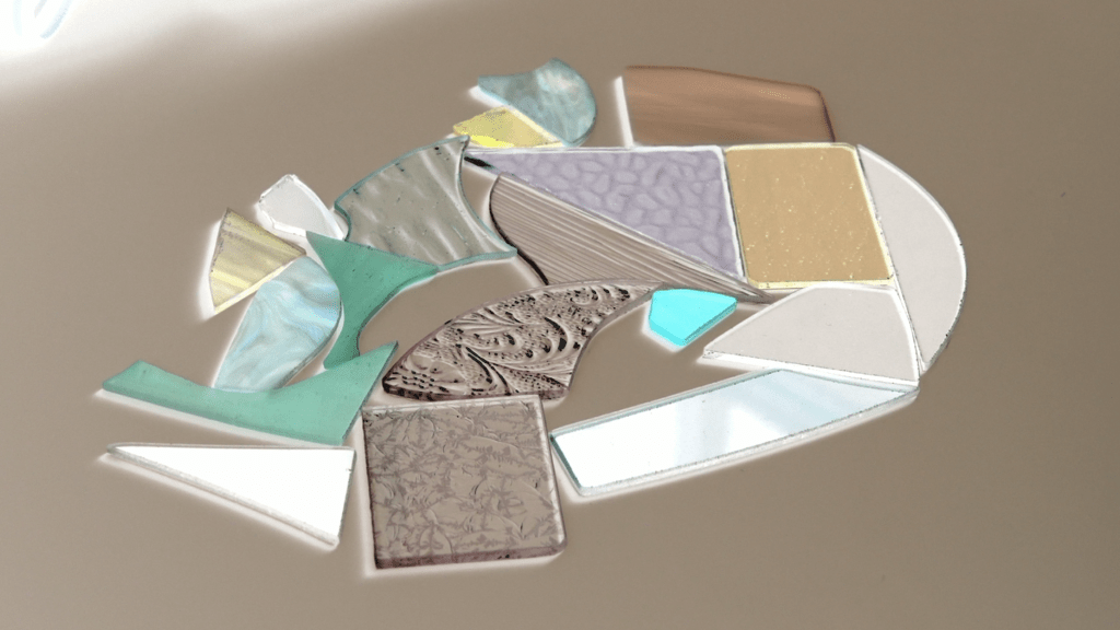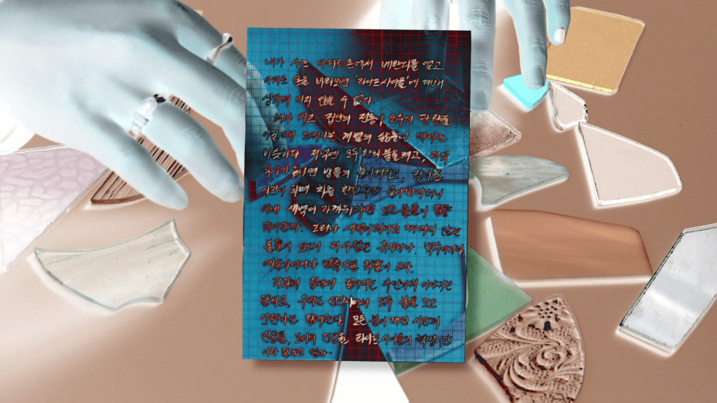 여러 사람에게 어머니가 그린 드로잉을 조각내서 보여줬다. 한 사람에게 개인적이고 사적인 의미를 담은 그림은 조각난 뒤 다른 사람의 기억과 연결되어 새로운 이야기 조각을 불러온다. 화면 속의 두 손은 쓰이고 남은 다양한 모양의 유리 조각들을 휘저으며 소리를 낸다.