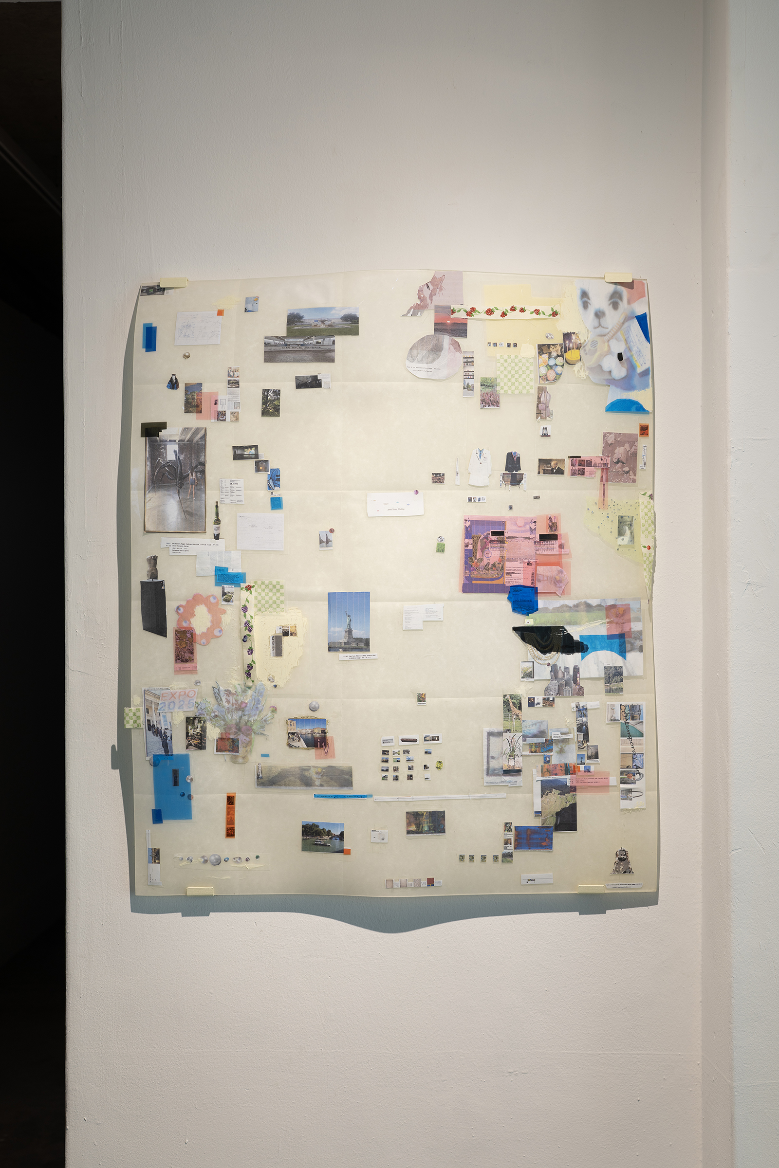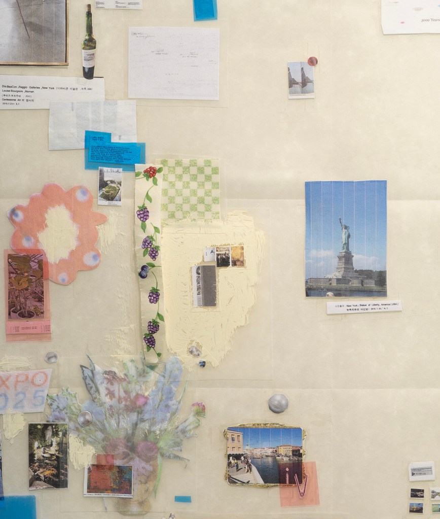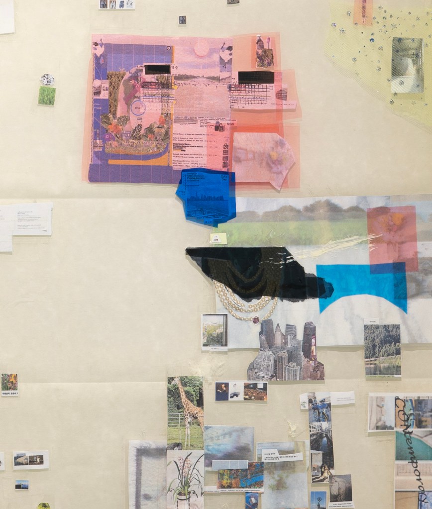 〈넝마 드로잉(Raggy Drawing)〉, 2025, Resin on tracing paper, inkjet printed images, cellophane tape, glass sheet, fabric, paint. 92.5 × 78.5 cm. 바탕 판 제공 정하슬린(Base Panel by Haseuline Jeong).